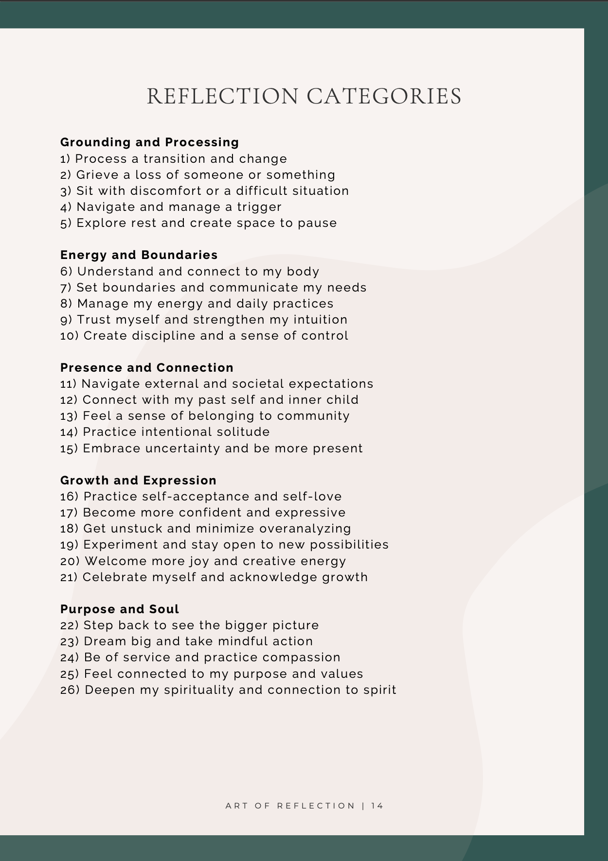 A 40-page resource on how to build a reflection practice along with 300+ prompts to connect with your inner self.